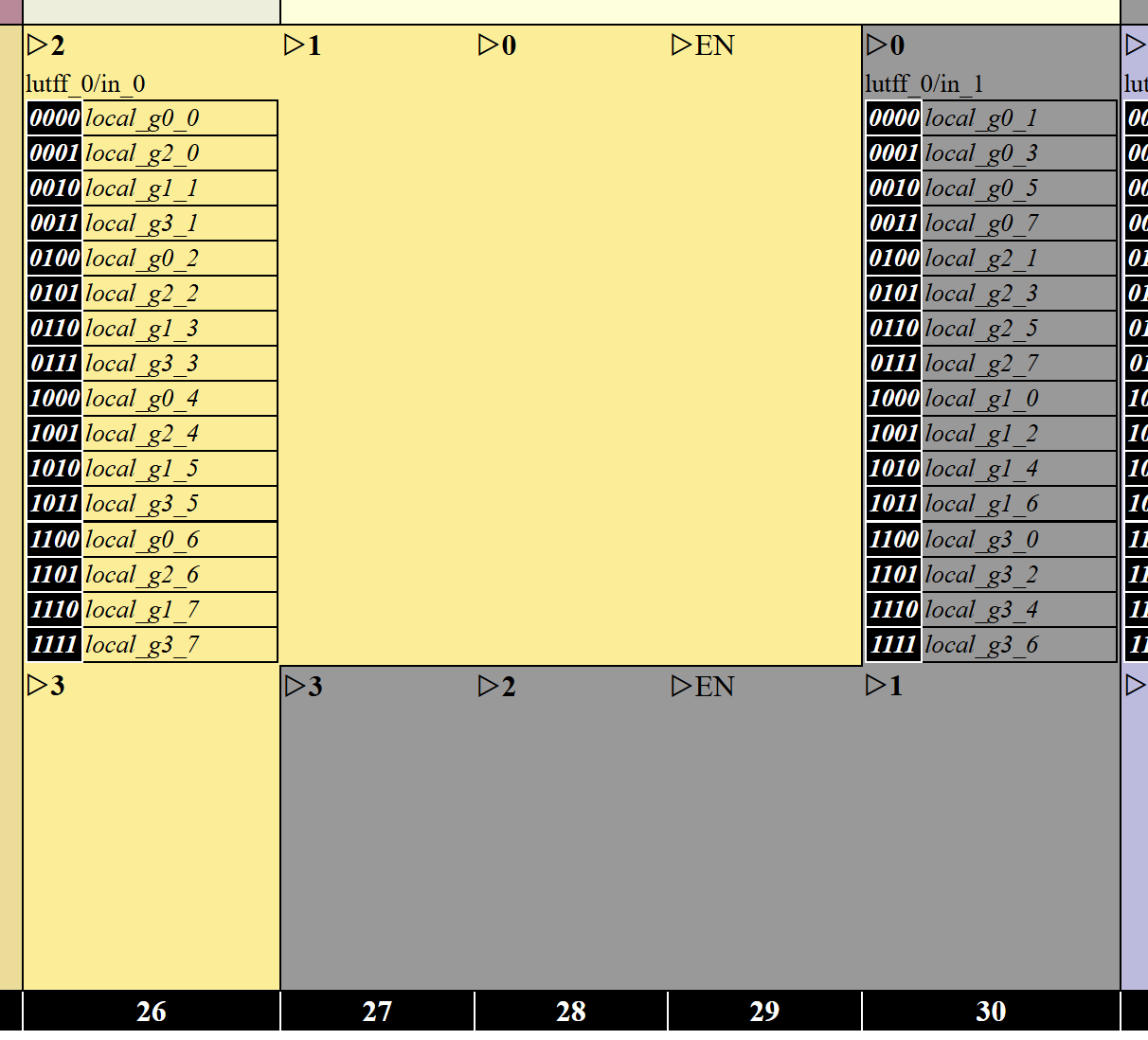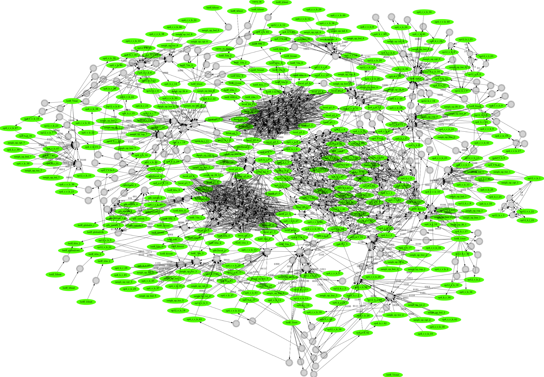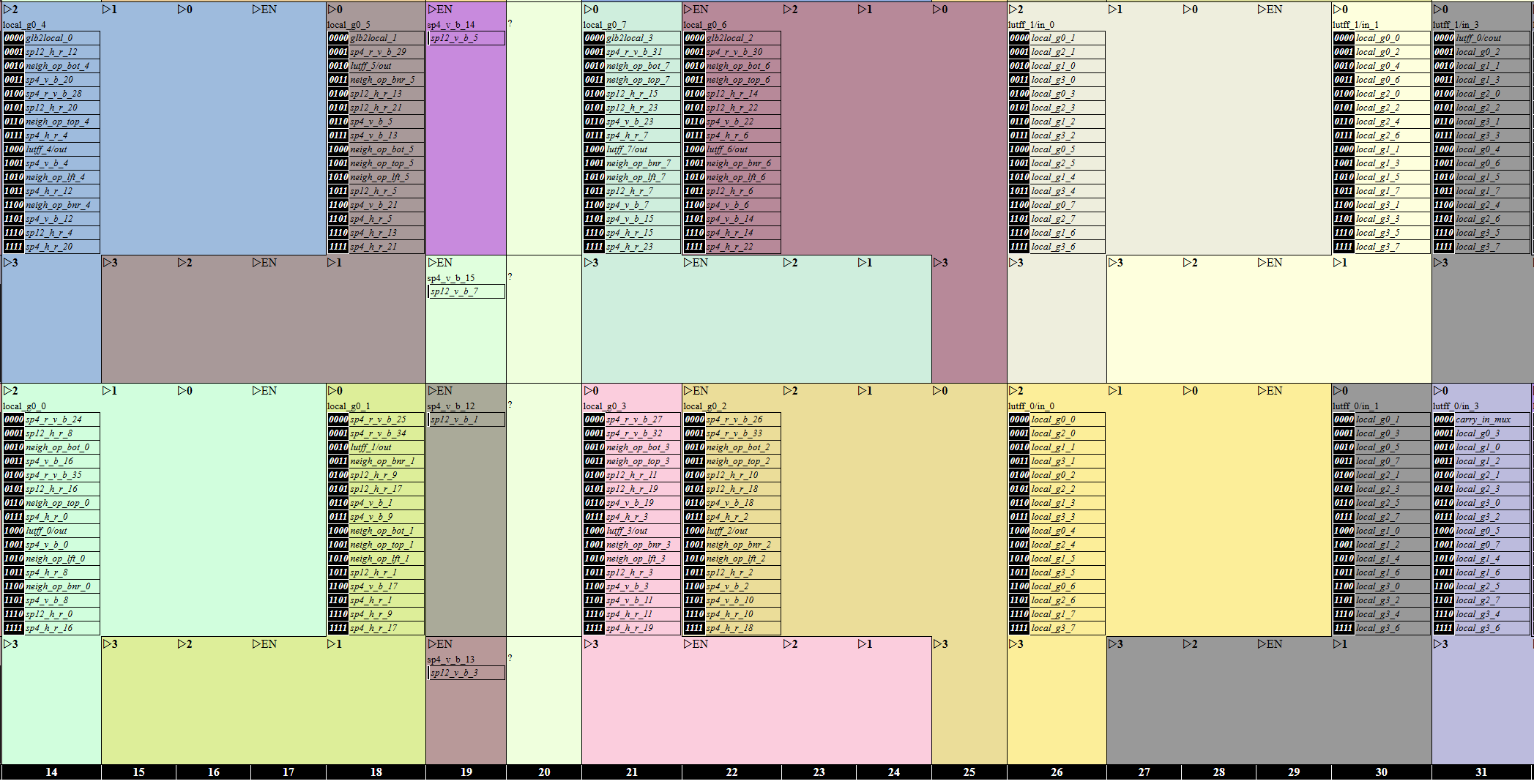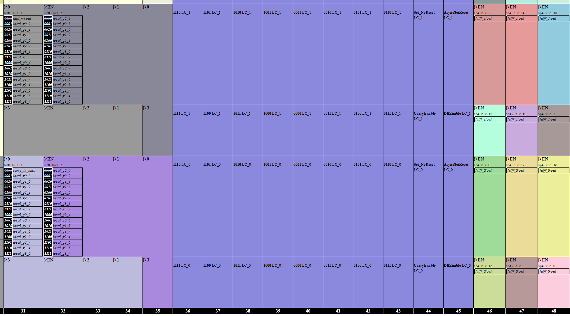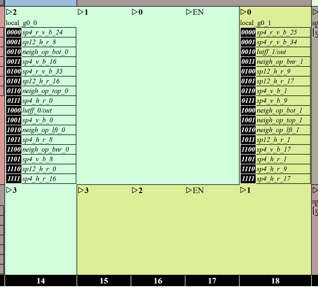 output / ────➤ local_gX_Y ────➤ lutff_A/in_B ────➤ Span4 H V RV /