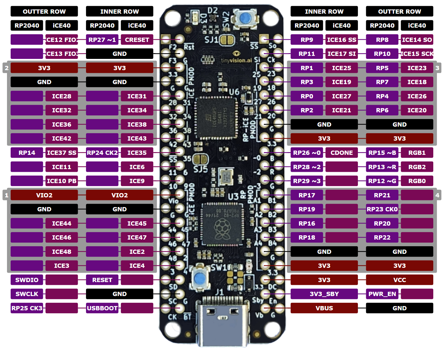 - Shared RGB LED, All RP2040 + iCE40 pins exposed